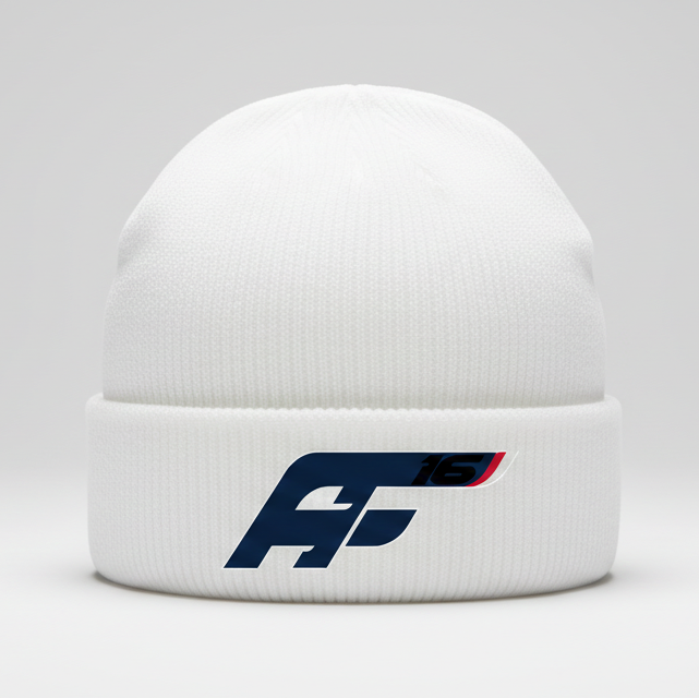Bonnet blanc classique, brodé avec le logo #16 en pastel bleu et un petit accent rouge tricolore. Tissage acrylique doux et stretch pour un fit parfait. Idéal pour le rallye de Monte Carlo ou de Suède.